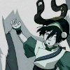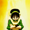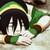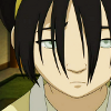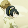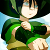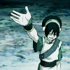 Description: Toph, seated and finger raised, as if she has something to contribute